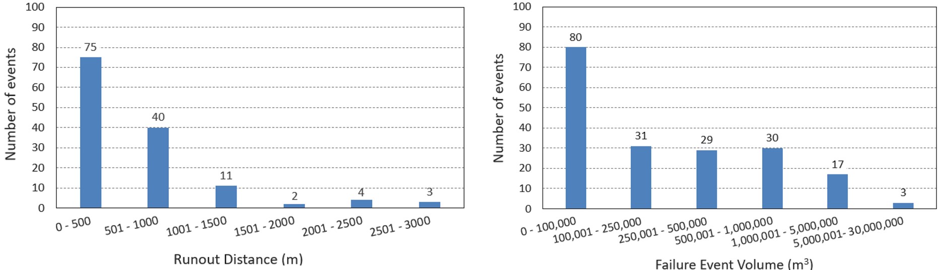 The mine waste in British Columbia, Canada can be end-dumped from large haul trucks, with dump heights ranging from 100’s of metres up to as much as 400 m. While most waste dumps perform well, there are cases where they have been subject to large-scale instabilities with significant adverse consequences. Review (Chen and Cunning 2025) of the data set of runout events up to 2005 shows that most of the failures exhibit runout distance less than 1 km, with a few cases displayed long runout distance of between 2 and 3 km which are considered to have very high mobility. Majority of the failure events are less than one million m3. The combined volume and distance data indicate the need for review of the potential runout zone as part of planning and management of waste dump facilities.