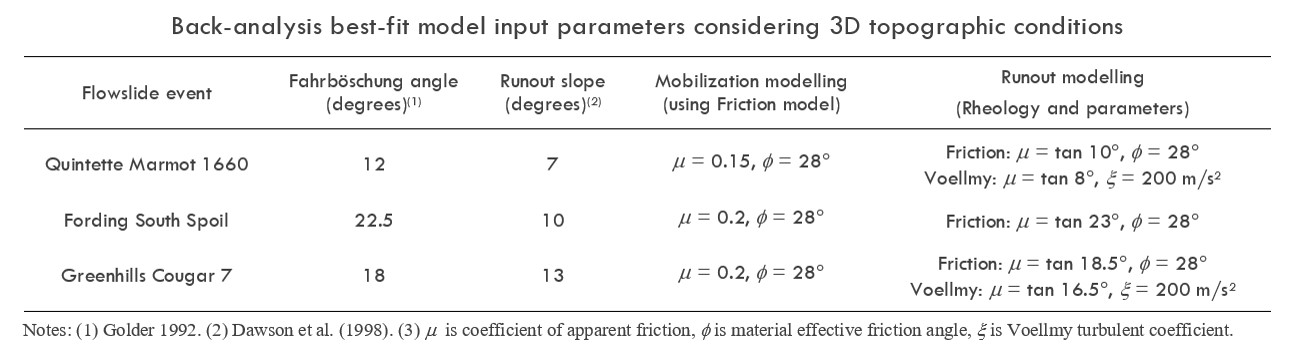 To validate the proposed modelling method, a forensic 3D back-analysis was performed using MADflow from mobilization to runout on three well-documented mine waste dump flowslide failures including the 1985 Quintette Marmot 1660 flowslide, the 1989 Fording South Spoil Stage 1 flowslide, and the 1992 Greenhills Cougar 7 flowslide. Realistic modelling parameters were evaluated in relation to the failure mechanism and measurable parameters from advanced laboratory tests. After the failure was initiated, the flowslide characteristics during runout were found to be more relevant to the properties of the unsaturated, non-liquefiable waste material, geometry and runout path conditions. The model predicted results were found to agree with the available field observations. Friction model is considered suitable for mobilization analysis, where the range of residual undrained shear strength ratio from 0.15 to 0.2 provides a reasonable estimate of the mobilized strength at the onset of collapse. For the subsequent modelling of material propagation, both friction and Voellmy models were found to simulate a (partially) confined valley during most of the runout, though friction model tends to allow more lateral spreading. For runout on open sloping ground (unconfined), frictional model appears more favour.